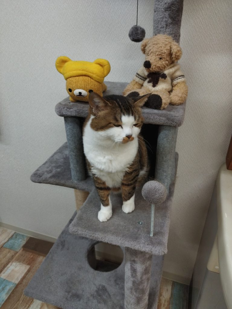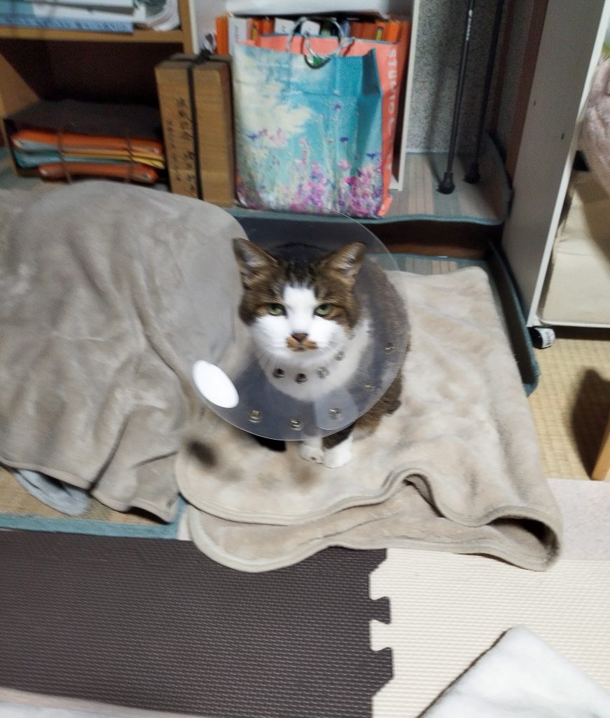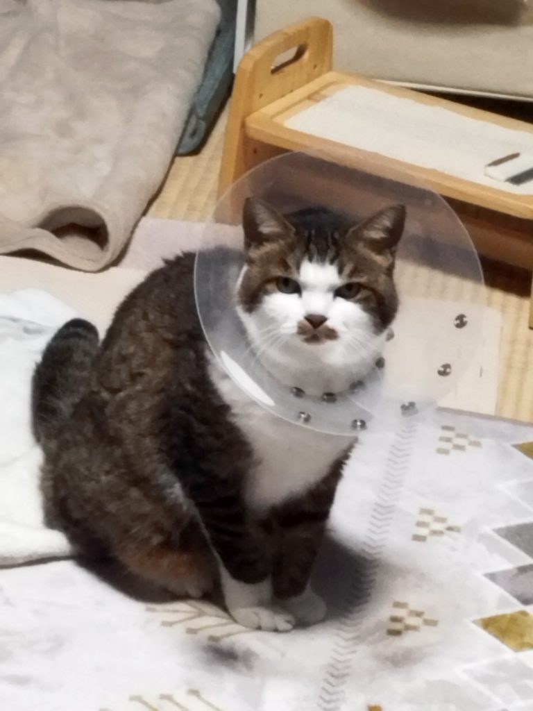 猫達はコゴミは変わらず元気ですがヨモギが腰と手の痛みで毛のなめ壊しをしているのでエリザベスカーラーを付けています、完治するまで通院です